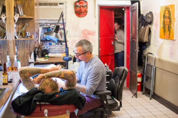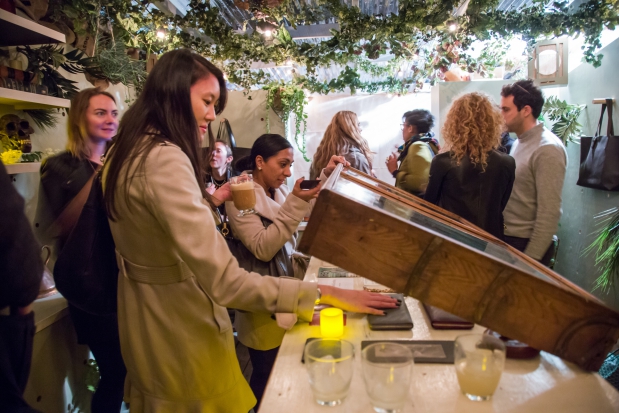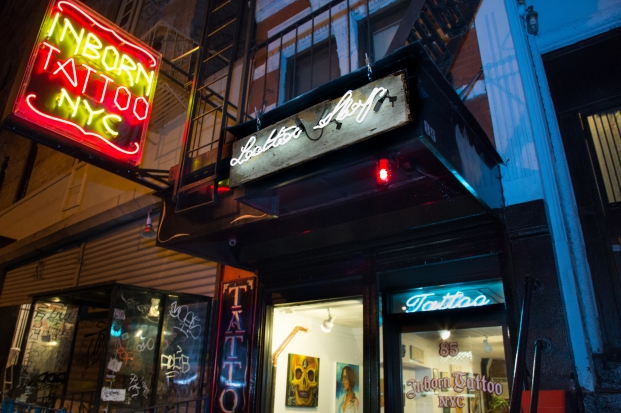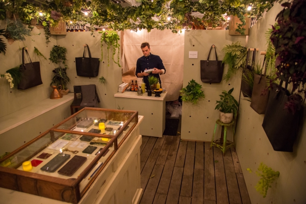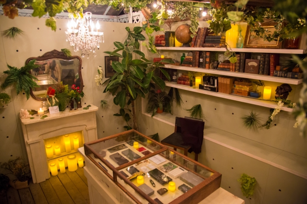 In November 2013, we created a "secret garden" pop-up for the online retailer Everlane to help them launch a new line of leather bags and wallets. The garden was situated in the back of Inborn Tattoo on the Lower East Side of Manhattan. Guests were lead in through the tattoo parlor, and were invited to enjoy the space for an hour at a time. We drew inspiration from greenhouses and old worn libraries, appointing the small space with leather-bound books and oddities, custom-built wooden furniture, a custom neon sign, and greenery from floor to ceiling.