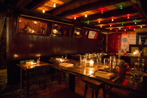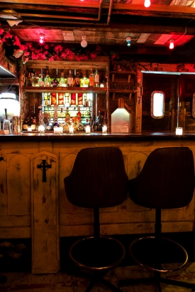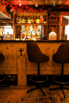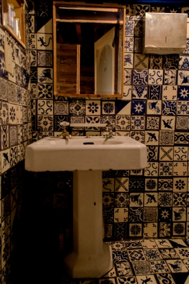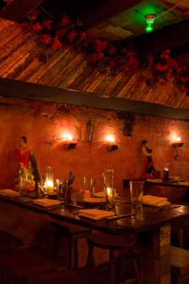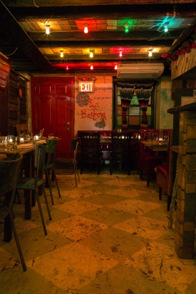 We took a raw basement space in the West Village and converted it to an old-school Mexican cantina with hand-painted floors, a wall that we replicated from a street corner in Oaxaca, and architectural elements that we rescued from a demolished Catholic church. We lined the ceiling with rows of colored lights, and peppered the hand-made tables and back bar with Mexican antiques and weathered bottles. We coated the bathroom floors and walls with hand-painted blue and white ceramic tiles. We salvaged a pair of 1800’s Mahogany garage doors and flipped them on their sides to divide the space.